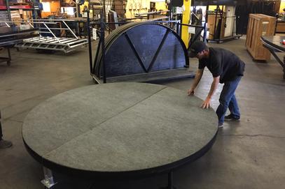 Spectrum provides tour quality rolling stage risers manufactured by Visionfab. VF Rolling Risers are coffin lockable for fast & easy set up with swivel locking / roll locking soft ride casters. Available in any size shape or height. Surface options include standard black, carpet, marley, marlite, grilled, clear & frosted plexy or digitally. Skirting & fascia options are endless. Great for stacking bands on arena tours, festivals and corporate shows.