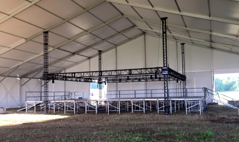 Spectrum provides Truss Grids & Stages in clear span tents. These systems are often requested for high end corporate events or 3rd, 4th or 5th stages at festivals. Systems are composed of VF truss and VF decking manufactured by certified welders at Visionfab. Typical systems are 44 x 44 with decking underneath. Certified structural engineering documentation is available on request. Too many size configurations to list, call us with your needs and Spectrum will tailor a system for your event. For major artists, higher trim, & more lighting options consider Spectrums "Apex Grids for Tents". Hundreds of options available make spectrum is a first choice vendor for your truss grid & stage in tent rental needs. Contact a Spectrum representative today to place your order.